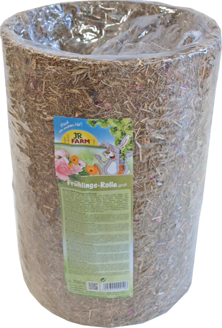 De lente komt eraan! Dwergkonijnen en andere grote knaagdieren zullen zich met plezier in deze met bloemen en kruiden omhulde JR Farm lenterol groot van bergweidehooi verstoppen en eraan knagen.