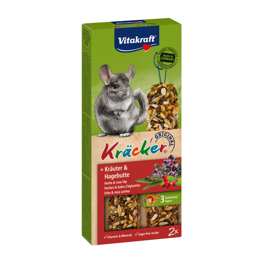Vitakraft Kräcker Original chinchilla kruiden en rozenbottel is een verantwoorde lekkernij en bevat lekkere granen, kruiden en rozenbottel op een natuurlijk knabbelhoutje.