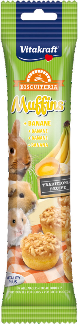 Vitakraft Muffins met banaan, een lekkere biscuitsnack met smakelijke banaan uit eigen bakkerij. De muffins zijn bereid volgens traditioneel recept en bevatten voedzame ingrediënten zoals eieren en meel. Een heerlijk tussendoortje voor alle knaagdieren en konijnen.