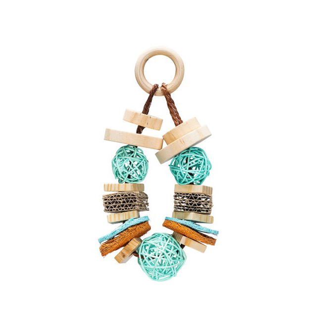 Speelgoed gemaakt van natuurlijke materialen zoals rattan ballen, kartonnen blokjes, houten schijven en luffa schijven. Inclusief ring om het speeltje op te hangen.