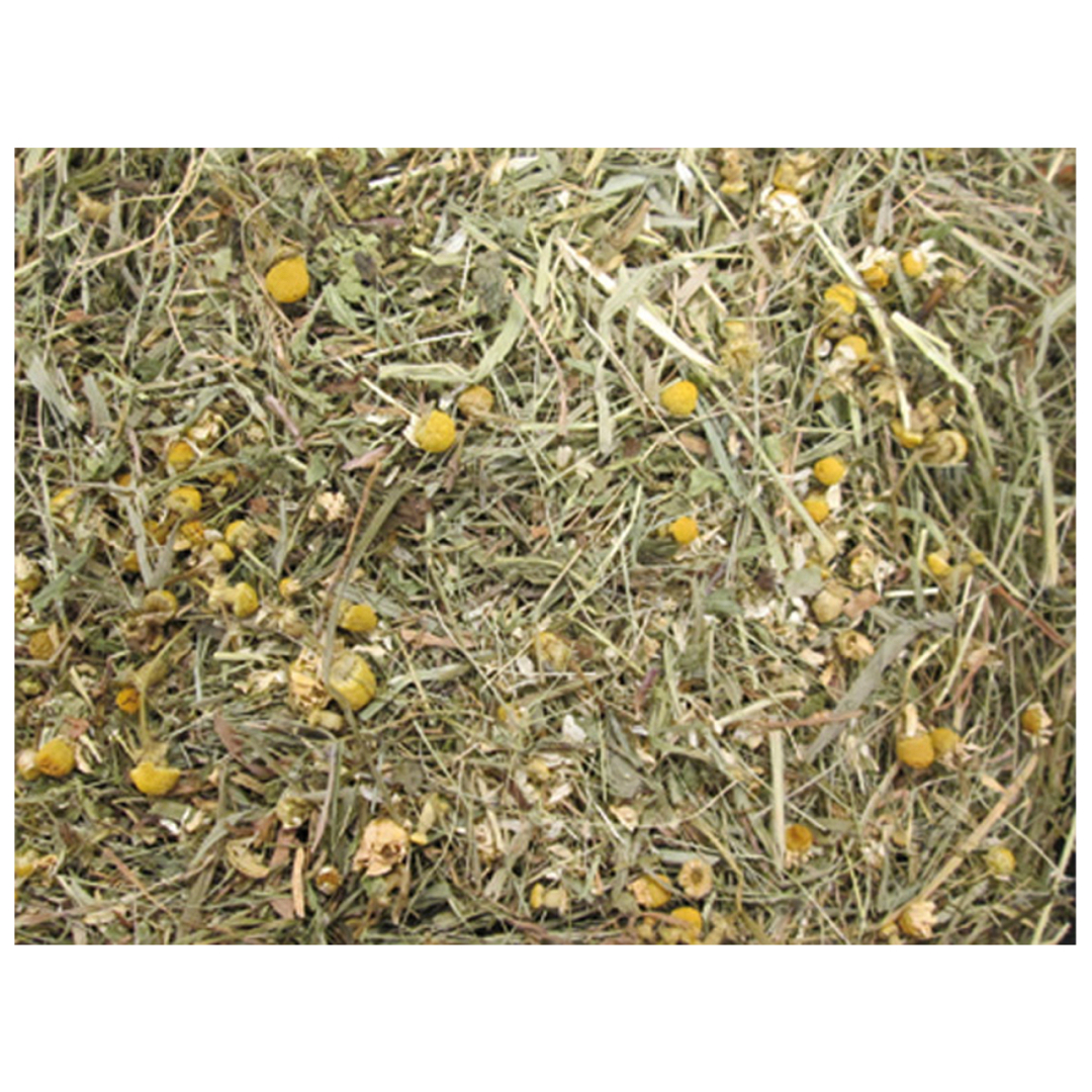 Aanvullende diervoeding van hooi met kamille en paardenbloem.