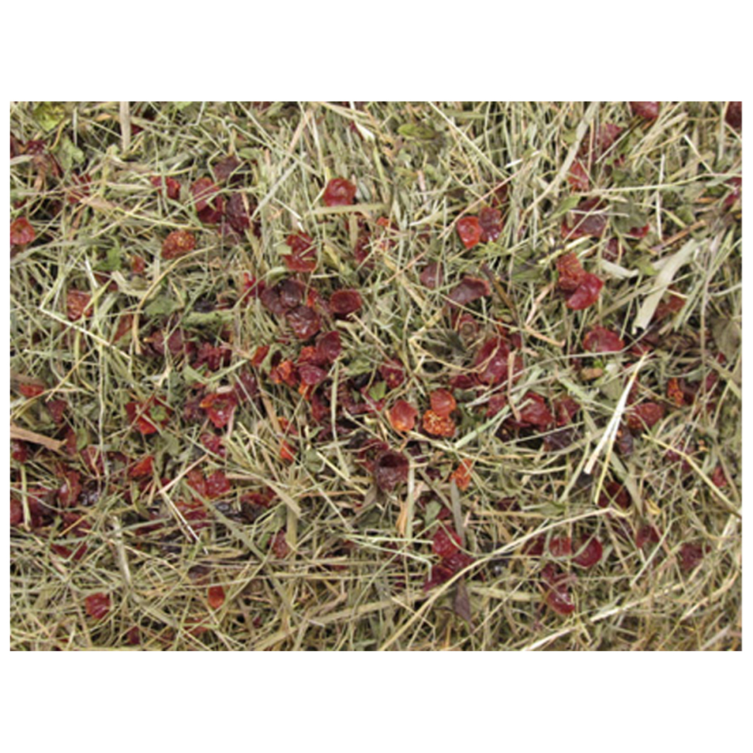 Aanvullende diervoeding van hooi met rozenbottel en mint.