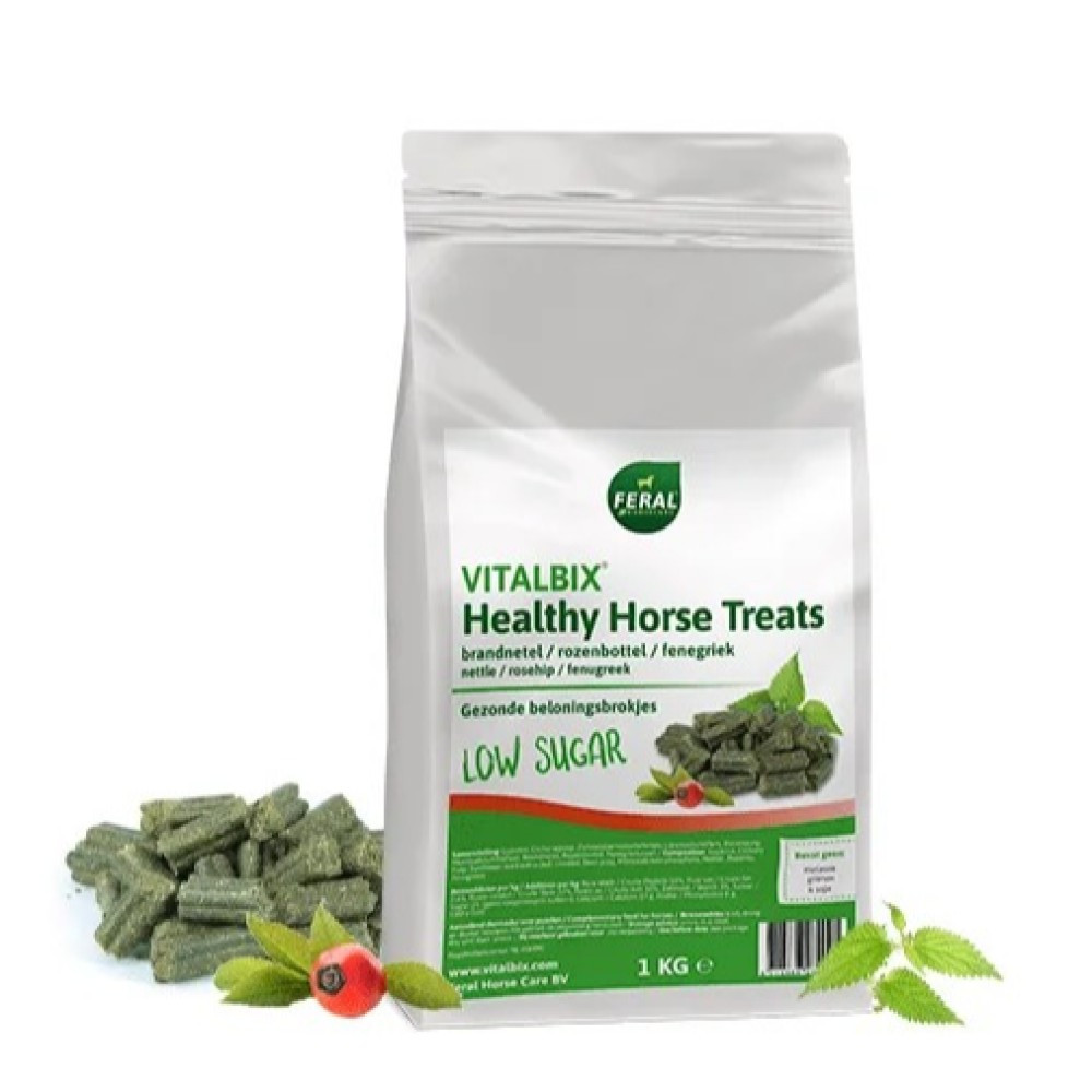 Vitalbix Healthy Horse Treats zijn vrij van granen en melasse en zijn gezonde beloningen voor paarden en pony's. De brokken zijn laag in zetmeel (3%) en suiker (4%). Boordevol gezonde ingrediënten zoals luzerne, cichorei, lijnzaad, bietenpulp, brandnetel, rozenbottel en fenegriek. Deze beloningsbrok is bovendien uitermate geschikt voor paarden met zomereczeem of stofwisselingsproblemen.
