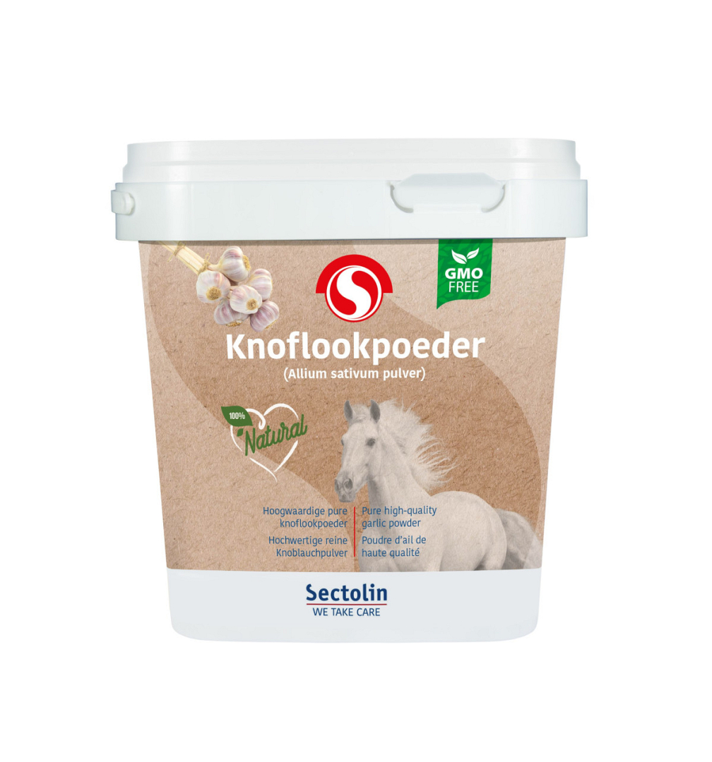 Knoflook is een rijke bron van vitamine A, B, C, E en K en is goed voor de ondersteuning van de algemene weerstand. Knoflook Poeder is een aanvullend diervoeder. Toediening door het voer 15 gram (ca. 1 maatbeker) per dag. Het voer kunt u rechtstreeks aan uw paard of pony blijven verstrekken.