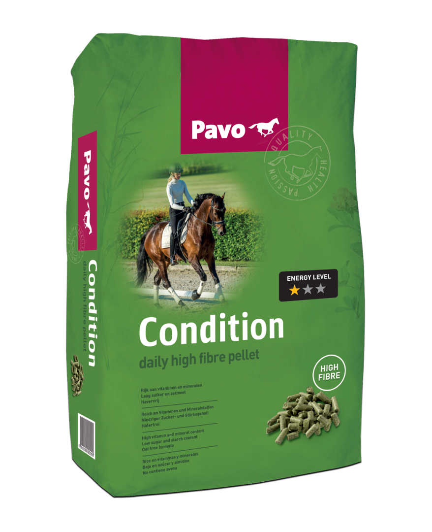 Pavo Condition is dé structuurrijke onderhoudsbrok voor paarden en pony’s in lichte arbeid (energy level low). Met Pavo Condition geef je de volledige dagelijkse verzorging aan vitaminen en mineralen. De complete vitaminering in combinatie met het hoge aandeel goed verteerbare vezels en het lage suiker- en zetmeelgehalte maken Pavo Condition tot een hoogwaardige en veilige onderhoudsbrok voor alle paarden die lichte arbeid verrichten. Pavo Condition is havervrij en daarmee ook geschikt voor paarden die snel heet worden van haver.