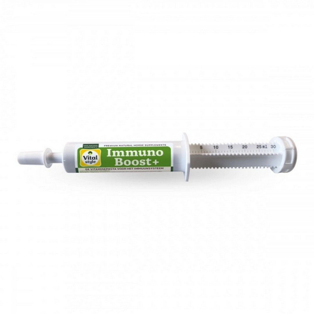 ImmunoBoost + is dé ondersteuning voor het immuunsysteem van paarden. De geconcentreerde pasta is onmisbaar in herstelperiodes en draagt bij aan een goede weerstand in periodes waarin dat nodig is. ImmunoBoost + bevat o.a.vitamine B12 en vitamine C dat bijdraagt aan de fitheid. De toegevoegde zink ondersteunt de afweer van het lichaam. Weten welke krachtige kruiden zijn toegevoegd? Ga naar de samenstelling!