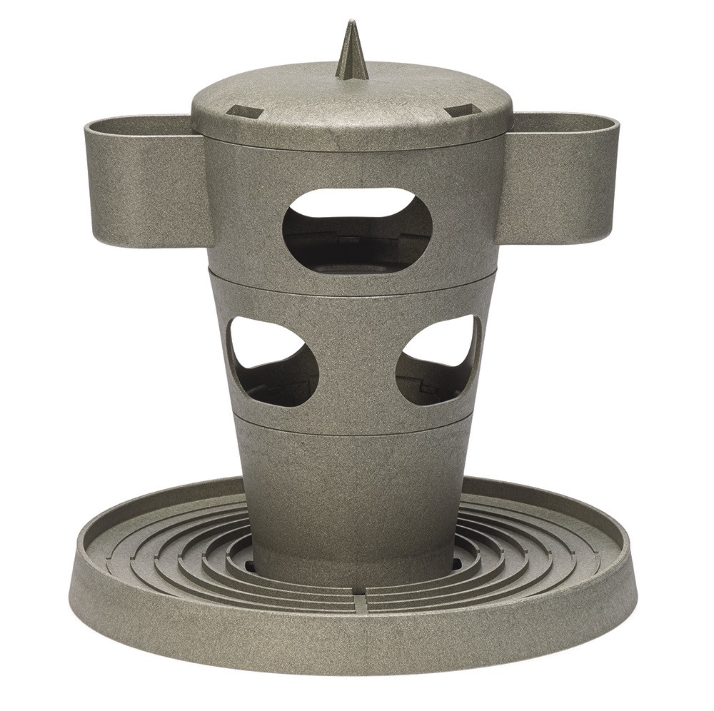 Aan de zijkanten van de snacktoren bevinden zich twee bakjes, waar je ook iets lekkers in kan stoppen. Voor het afvoeren van regenwater is de bodemplaat van de toren voorzien van een afwateringskanaal. Tevens bevinden zich in de bodemplaat 4 kleine gaatjes zodat je de toren vast kan zetten in de grond. De snacktoren kan worden gereinigd in de vaatwasser op eco-stand. De snacktoren is ecologisch verantwoord, deze is namelijk gemaakt van 100% gerecycled plastic afkomstig van ca. 132 drinkpakken.