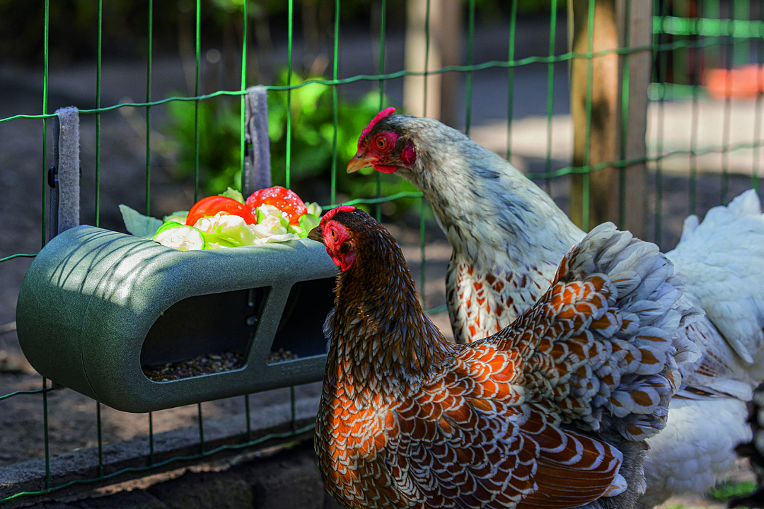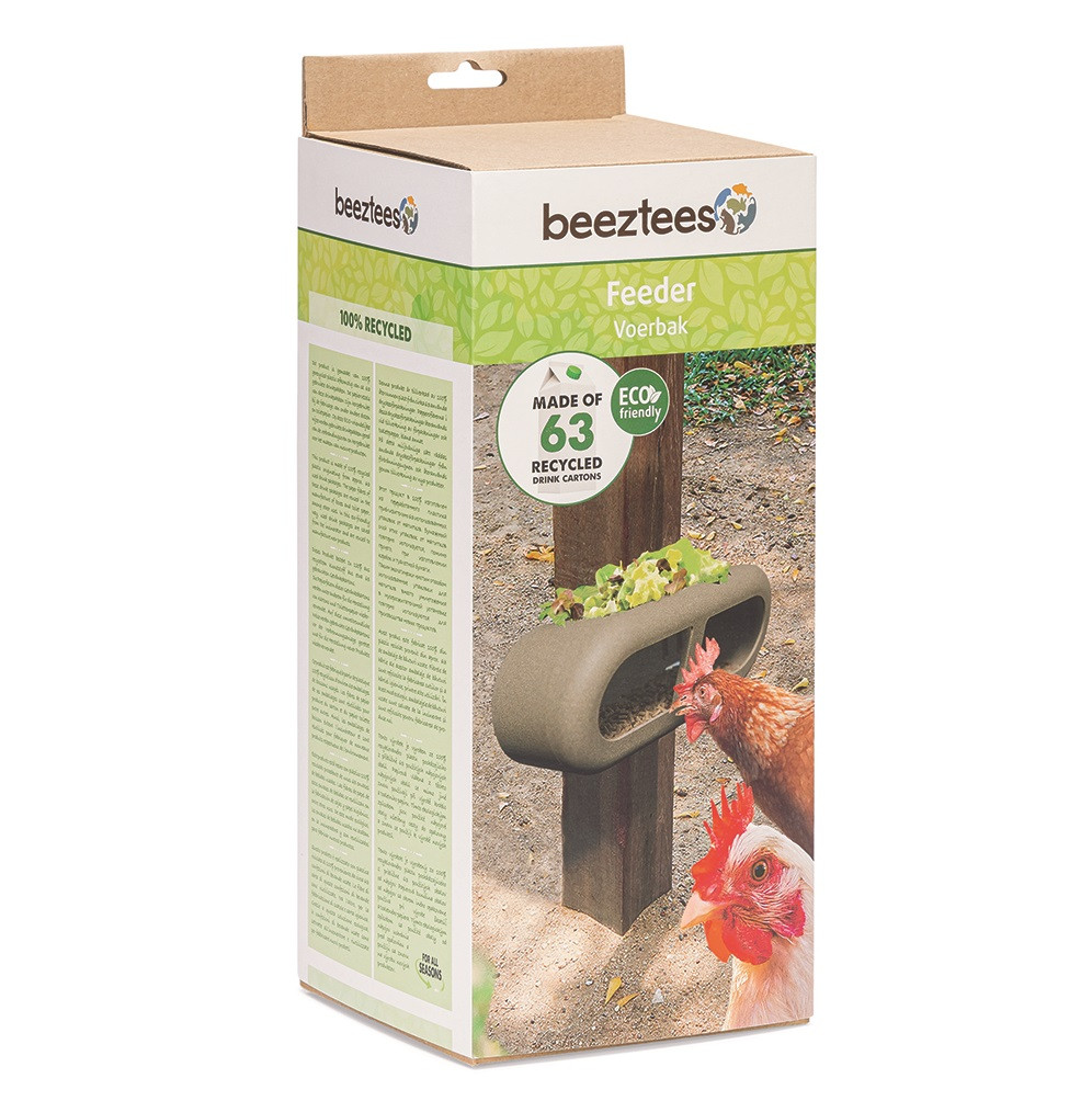 Daarnaast loopt de bovenkant van de voorbak ook iets naar voren, zodat het regenwater er minder gemakkelijk in komt. Zo blijft het voer lekker vers en knapperig. Doordat de bovenzijde van de kippenvoerbak plat is, kan je deze gebruiken voor het aanbieden van extra snacks. De toren kan gereinigd worden op eco-stand in de vaatwasser. De voerbak is ook nog eens ecologisch verantwoord, deze is namelijk gemaakt van 100% gerecycled plastic afkomstig van ca. 63 drinkpakken.