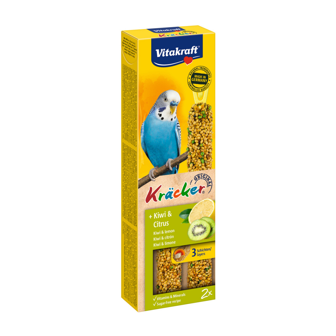 Vitakraft Kräcker Original parkiet met kiwi en citrus is een verantwoorde lekkernij en bevat lekkere granen, zaden, kiwi en citrus op een natuurlijk knabbelhoutje.