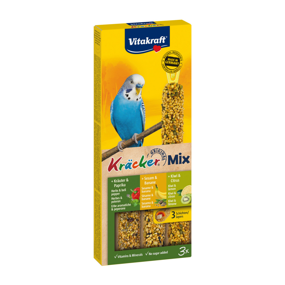 Vitakraft Kräcker Trio-Mix parkiet banaan/kruiden/kiwi is een verantwoorde lekkernij, 3 verschillende smaken kräckers in de mix met lekkere banaan, kruiden en kiwi op een natuurlijk knabbelhoutje.