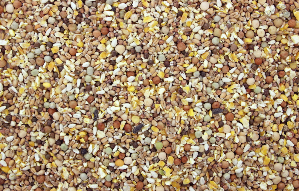 Samenstelling: Tarwe, mais, sorghum, erwten, wikken, kardizaad.