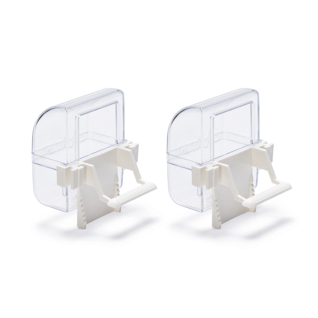Transparante voer- en drinkbak. Gemakkelijk aan de vogelkooi te bevestigen.